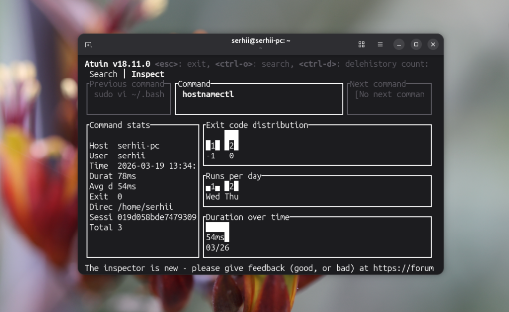 Atuin сохраняет не только сами команды, но и информацию об их выполнении. Когда вы выбрали команду в окне поиска, вы можете нажать сочетание клавиш Ctrl+O чтобы посмотреть доступную информацию:
