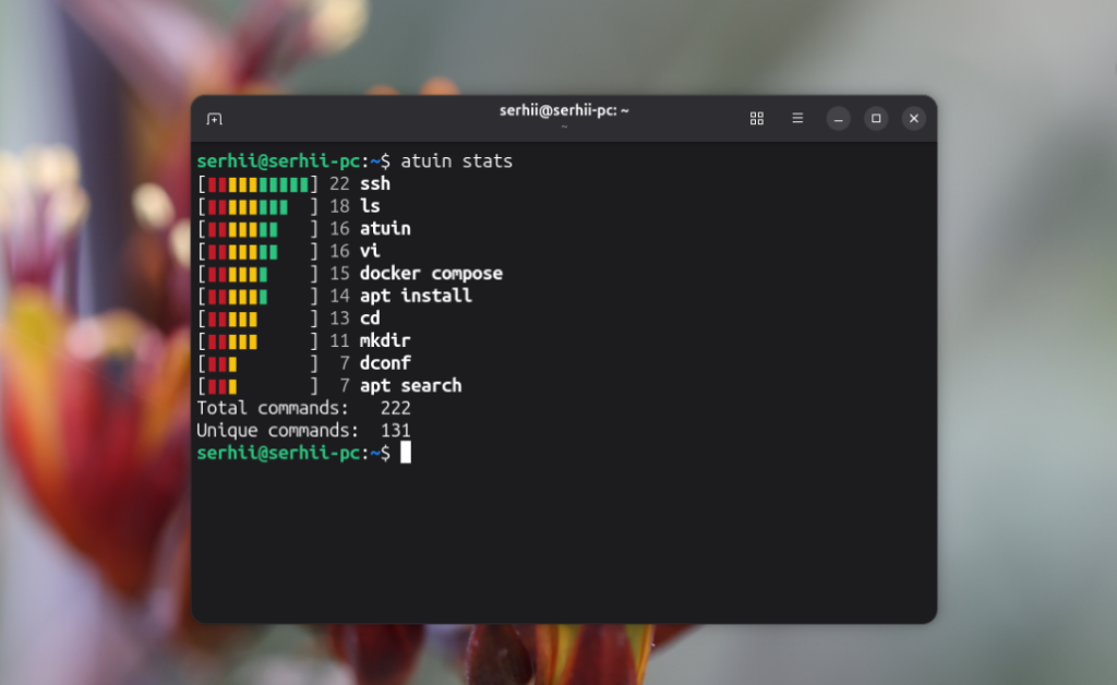 Когда-то были популярны скрипты, с помощью которых можно было посмотреть топ команд, которые вы чаще всего вводите. Это можно сделать и с помощью atuin. Для этого выполните команду stats: