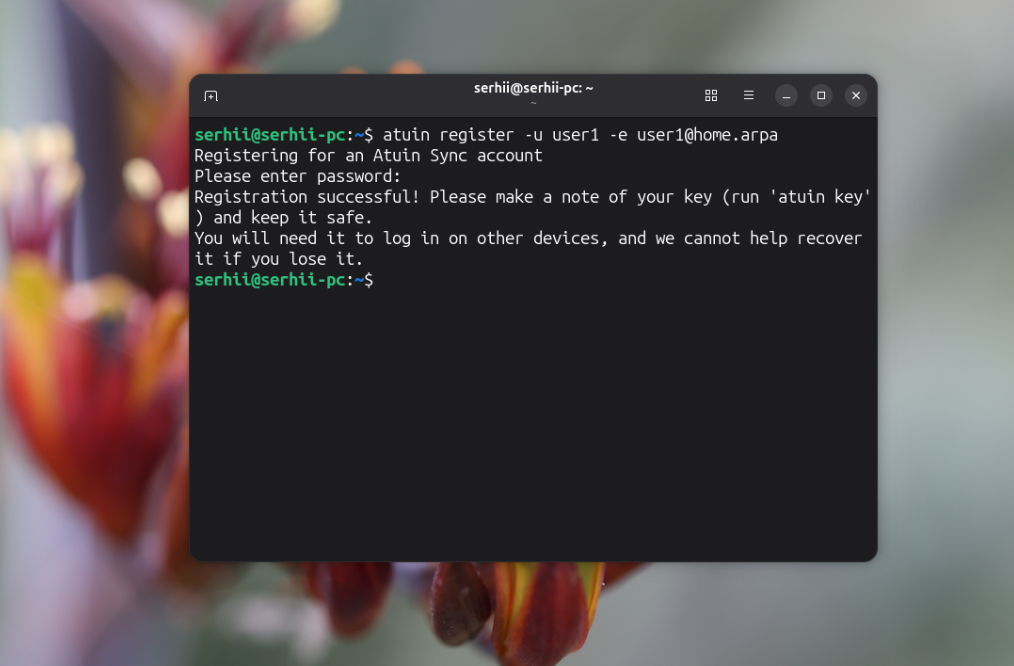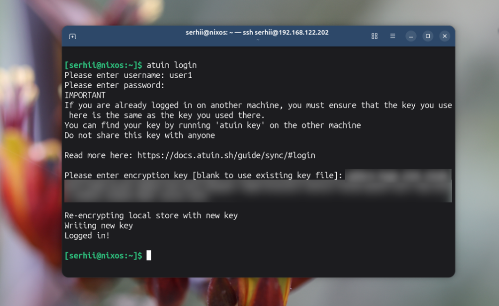 Кроме того Atuin позволяет синхронизировать историю команд на сервер чтобы иметь к ней доступ на нескольких устройствах. По умолчанию синхронизация отключена и её использовать не обязательно. Если вы решите что вам нужна синхронизация, то вы можете использовать облачное хранилище Atuin, или развернуть собственный сервер. Все команды которые передаются на сервер шифруются с помощью приватного ключа который хранится только на ваших устройствах и никуда не передается. При авторизации нового устройства вам также нужно будет указать этот ключ чтобы получить доступ к командам.