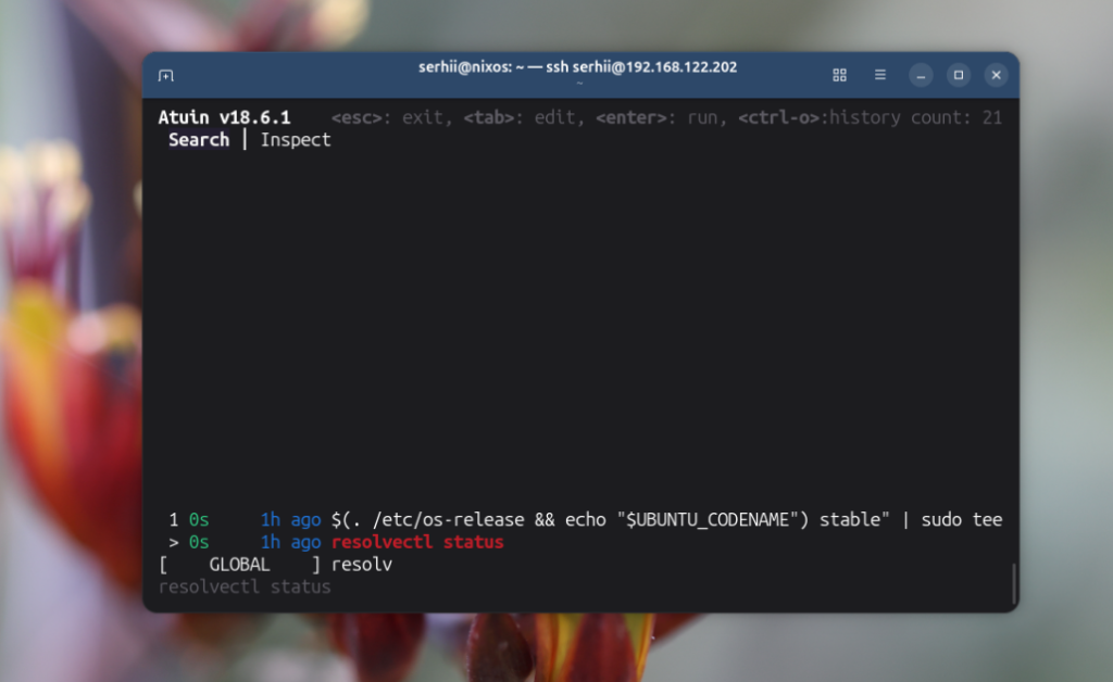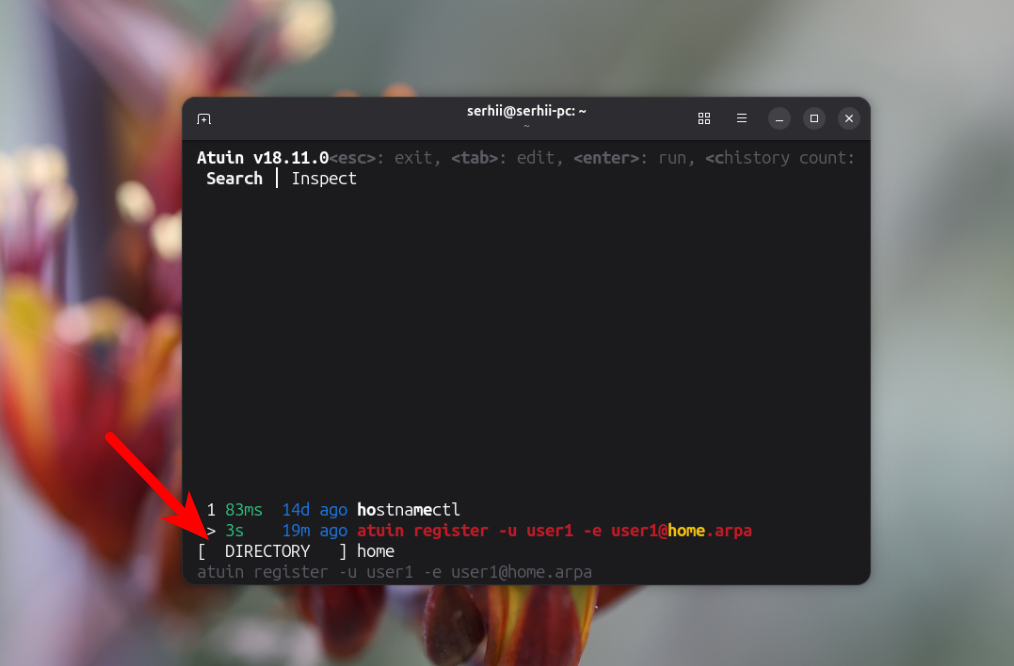 Atuin это программа, написанная на Rust, которая сохраняет все выполняемые вами в терминале команды в базу данных SQLite. Также она заменяет поиск команд shell, который появляется после нажатия сочетания клавиш Ctrl+R и клавиши просмотра предыдущих команд. После установки при нажатии Ctrl+R будет открываться вот такое окно с живым поиском по истории команд, где вы можете начать набирать команду и выбрать подходящую из списка: