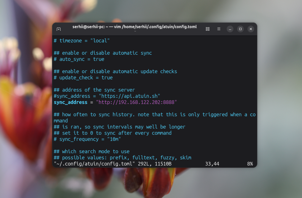 По умолчанию синхронизация с сервером отключена. Чтобы все заработало необходимо настроить адрес сервера и зарегистрировать клиента. Для того чтобы настроить использование вашего сервера нужно открыть конфигурационный файл ~/.config/atuin/config.toml и прописать там адрес вашего сервера, в нашем примере это http://192.168.122.202:8888