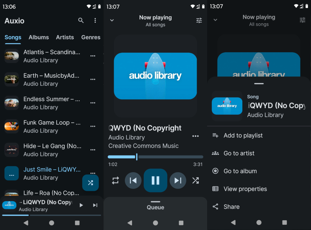 Очень простой аудиоплеер для Android. Он имеет очень минималистичный интерфейс и только самые необходимые функции. Вы можете выбрать нужные папки как источники медиа, создавать плейлисты, перемешивать и зацикливать треки в плейлисте. Кроме того можно фильтровать треки по исполнителю, альбому и жанру.
