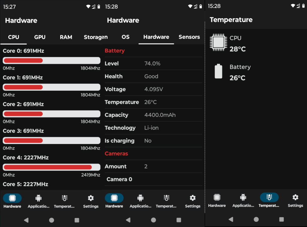 Это простое приложение, которое отображает информацию о железе смартфона. Тут можно просмотреть не только характеристики и загрузку процессора, памяти и чипсета, но и температуру, а также показания разных сенсоров встроенных в телефон. Приложение имеет открытый исходный код и в отличии от CPU-Z не содержит рекламы.