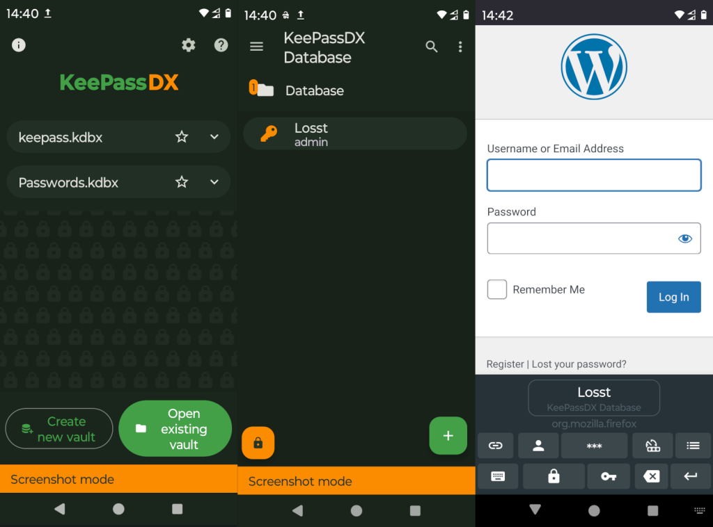 Если вы пользуетесь менеджером паролей KeePassXC на компьютере, то эта програма вам понравится. Это аналог KeePassXC для телефона. Он использует тот же формат базы данных для хранения паролей в зашифрованном виде, поэтому вы можете синхронизировать пароли между ПК и телефоном просто скопировав файл базы данных. Все ваши пароли находятся локально и не синхронизируются в облако. А для удобной вставки паролей в браузер здесь есть специальная клавиатура Magickboard от KeepassDC, активировав которую вы можете выбрать учетную запись и вставить для неё пароль из базы данных.