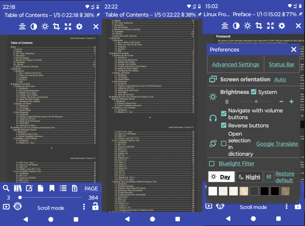 Если вам нужно открывать для просмотра PDF файлы, книги либо любые другие документы на телефоне, то вам понадобится Librera Reader. Я раньше использовал FBookDroid для этих целей но та программа уже давно не поддерживается и не работает нормально на современных версиях Android. Здесь есть режим перелистывания страниц, как в книге, а также режим скролинга. Поддерживается синтез речи, выделение цветом, закладки, можно выбрать светлый или темный режим интерфейса.