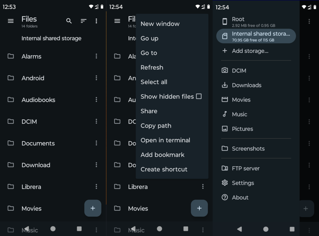Если вам нужен простой файловый менеджер, который в то же время дает доступ ко всей видимой файловой системе и не имеет рекламы, Material Files не плохой выбор. Приложение имеет современный интерфейс в стиле Material и поддерживает все функции необходимые для работы с файлами. Кроме того тут можно запустить FTP сервер с помощью которого можно передавать файлы с телефона или на телефон по сети и само собой открытый исходный код.