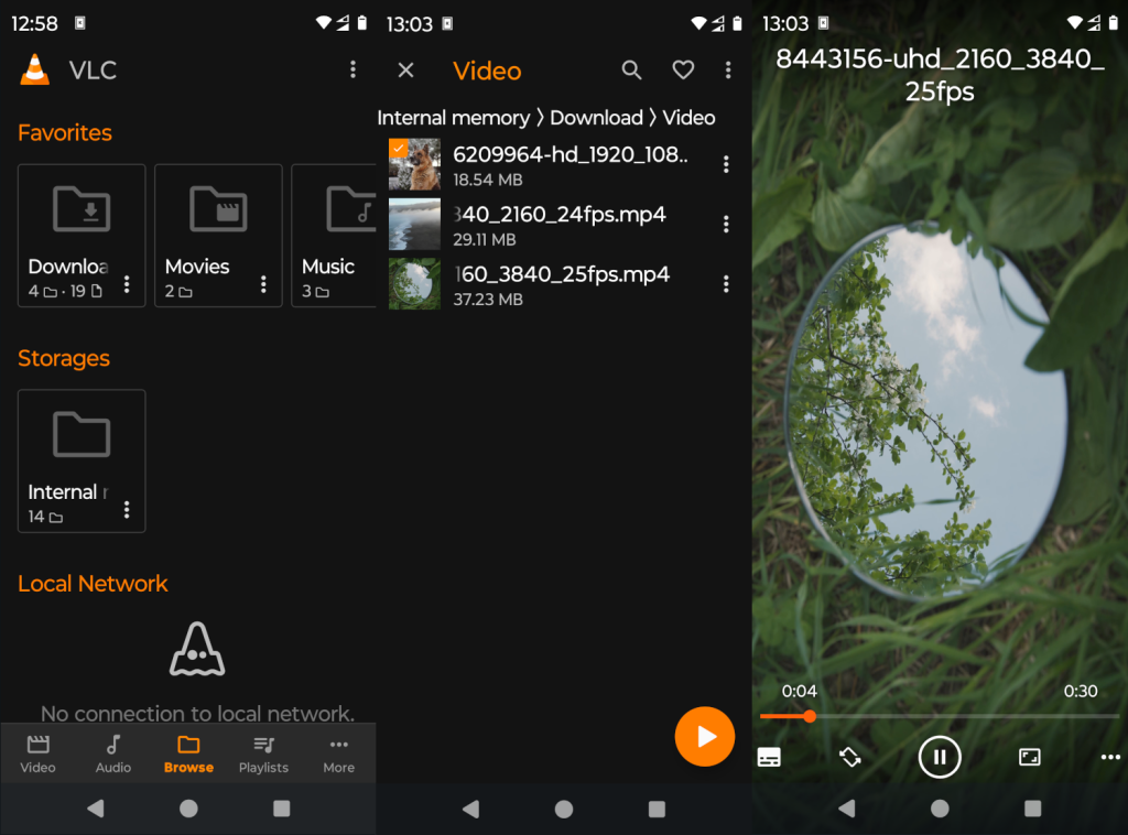 Я всё ещё считаю видео плеер VLC лучшим видеоплеером для Andrid и на ПК. Удобный интерфейс, поддержка огромного количества форматов медиа, переключения поддержка субтитров и аудиодорожек и много другое. Кроме того мобильное приложение позволяет искать видео в памяти телефона, подсвечивая видео, которые вы уже просмотрели, а также запоминает позицию на которой вы завершили просмотр. Кроме того, здесь можно попытаться скачать субтитры для фильма прямо в интерфейсе приложения.