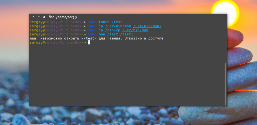 Отказано в доступе, но как такое может быть, ведь мы выполняли команду от суперпользователя? Для Apparmor неважно root это или нет, сказано нет доступа к файлам, значит нет, и все. Возвращаем нашу man на место: