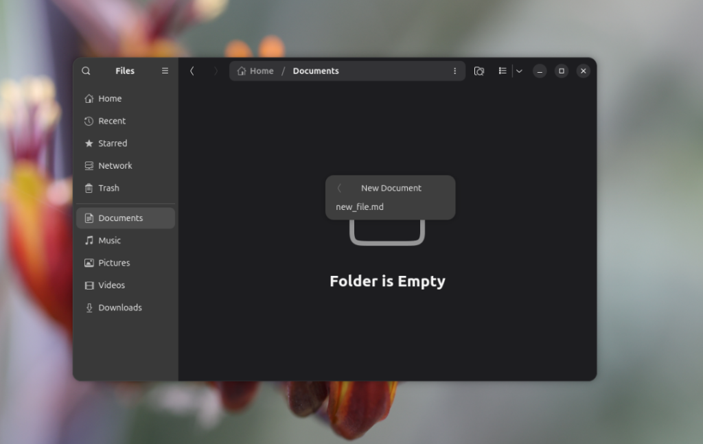 Для того чтобы в контекстном меню Nautilus появилась возможность создавать файлы как в Windows, нужно добавить шаблоны этих файлов в папку ~/Templates. Например, добавим файл Markdown: