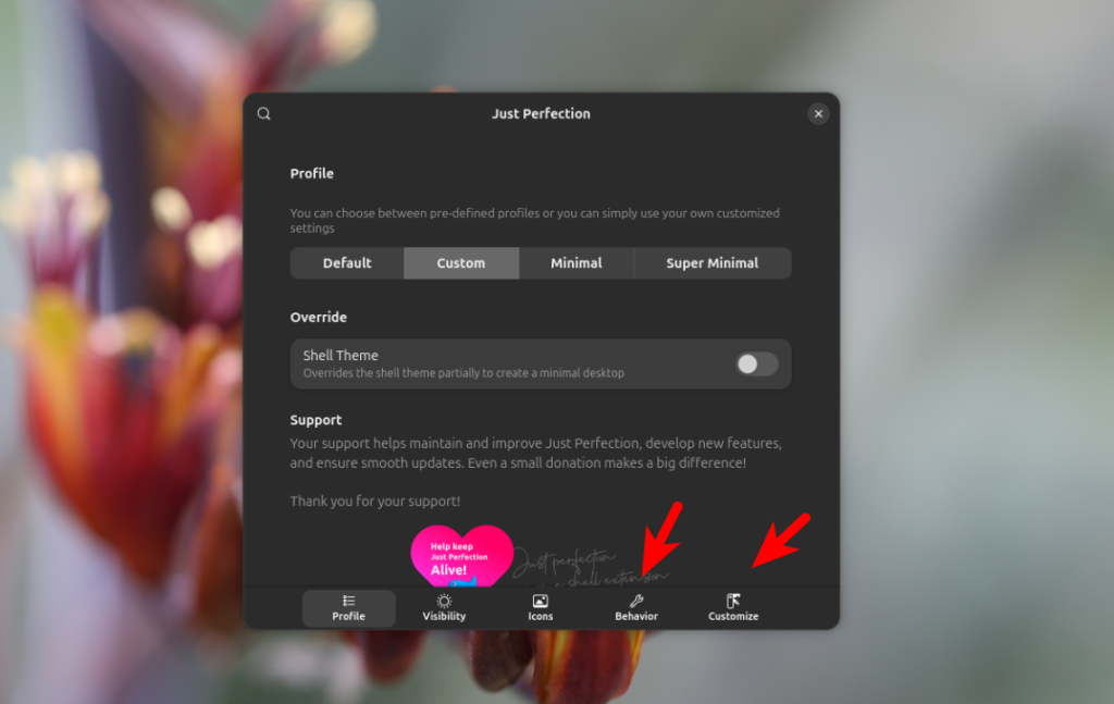 Это расширение позволяет настроить некоторые особенности поведения рабочего стола, а также его внешний вид. Например, можно переместить панель GNOME вниз экрана и сделать так чтобы при запуске системы открывался рабочий стол, а не обзор приложений. Окно настроек расширения выглядит вот так. Нужные настройки можно найти на вкладке Behavior и Customize: