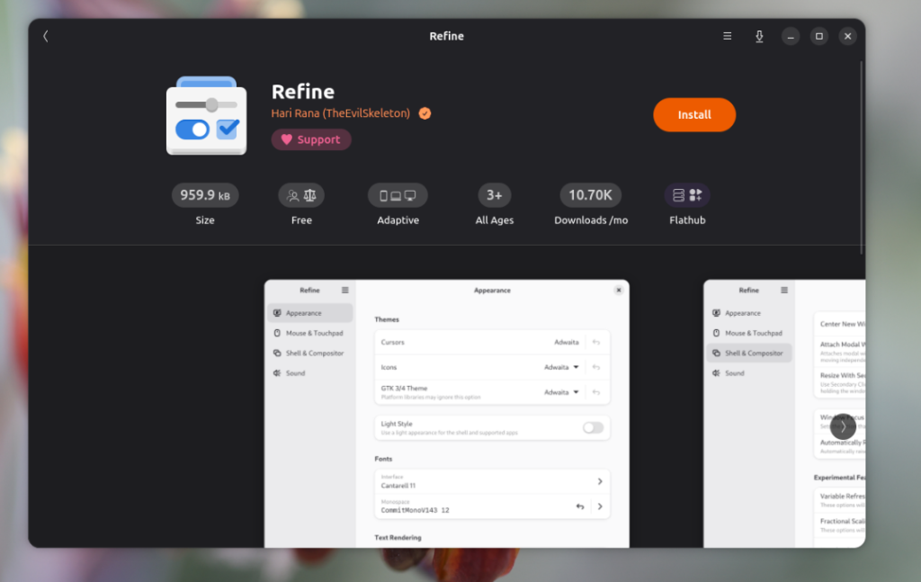 Теперь, когда Flatpak поддерживается системой, можно установить несколько приложений для более тонкой настройки GNOME. Это Refine и GDM Settings. Первая позволяет настроить шрифты и тему окружения, кнопки управления окнами и многое другое. Вторая позволяет настроить стили экрана входа GDM. Обе программы можно найти в Bazaar: