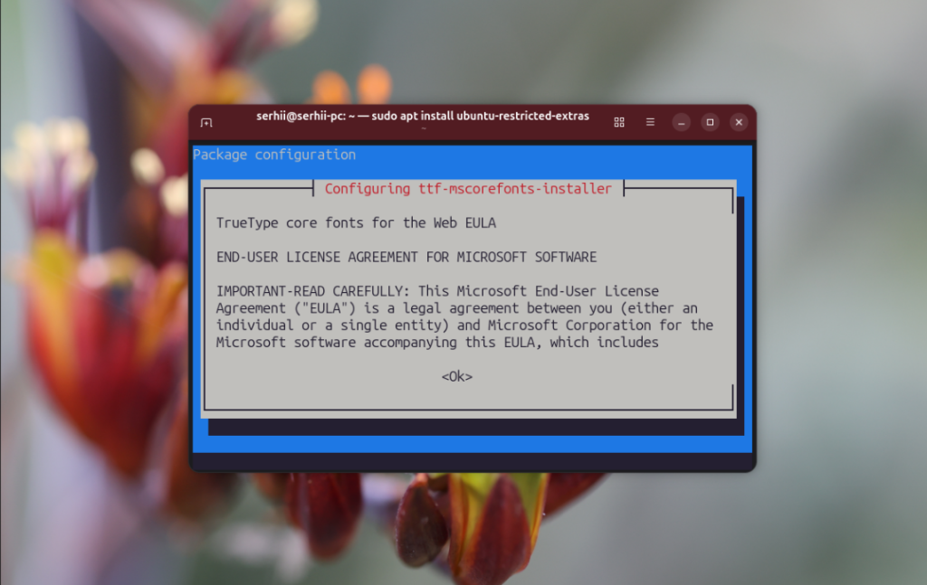 Для того чтобы установить также дополнительные шрифты вам нужно будет принять лицензию ELUA. Нажмите Tab чтобы переместить курсор на Ok и Enter. А затем используйте клавиши со стрелками чтобы выбрать Yes:
