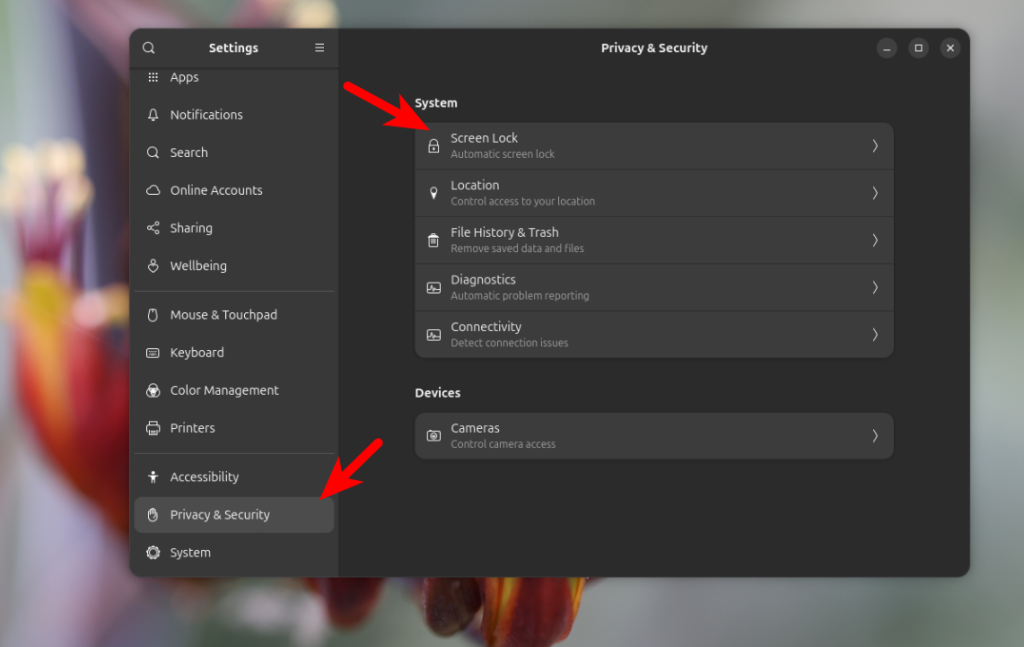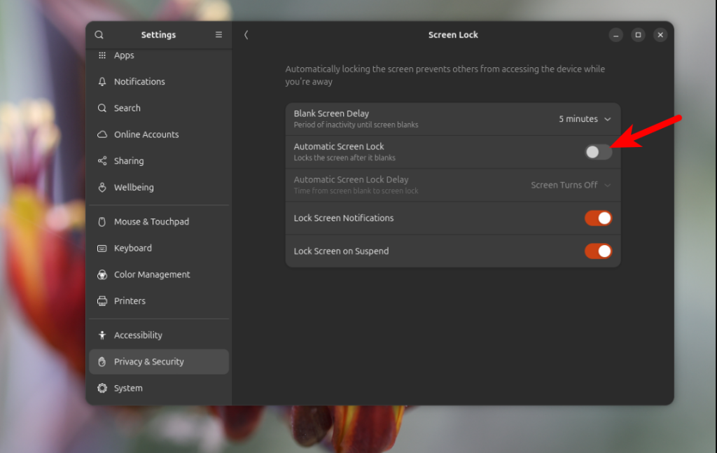 В целях безопасности, сессия пользователя блокируется после нескольких минут бездействия. Чтобы это отключить откройте утилиту Settings, перейдите в Privacy & Security и выберите Screen Lock:
