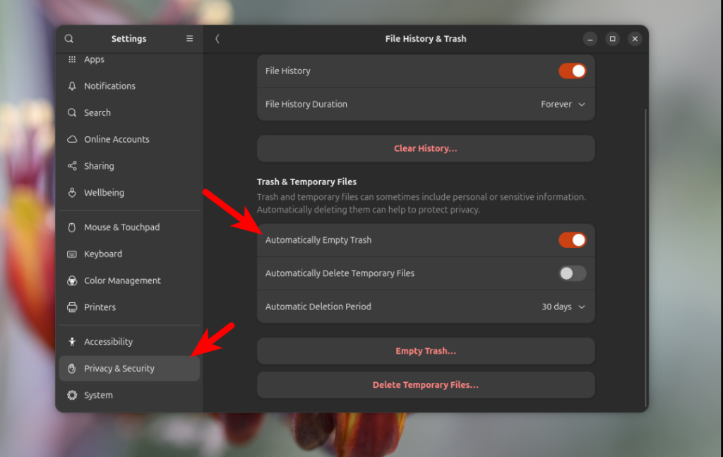 По умолчанию файлы отправленные в корзину не удаляются никогда. Поэтому если место на диске закончится вам нужно будет чистить корзину вручную. Однако можно сделать так, чтобы файлы, которые находятся в корзине дольше 30 дней удалялись автоматически. Для этого в том же разделе Privacy & Security выберите File History & Trash и в разделе Trash & Temporary Files включите опцию Automatically Delete Trash Content:
