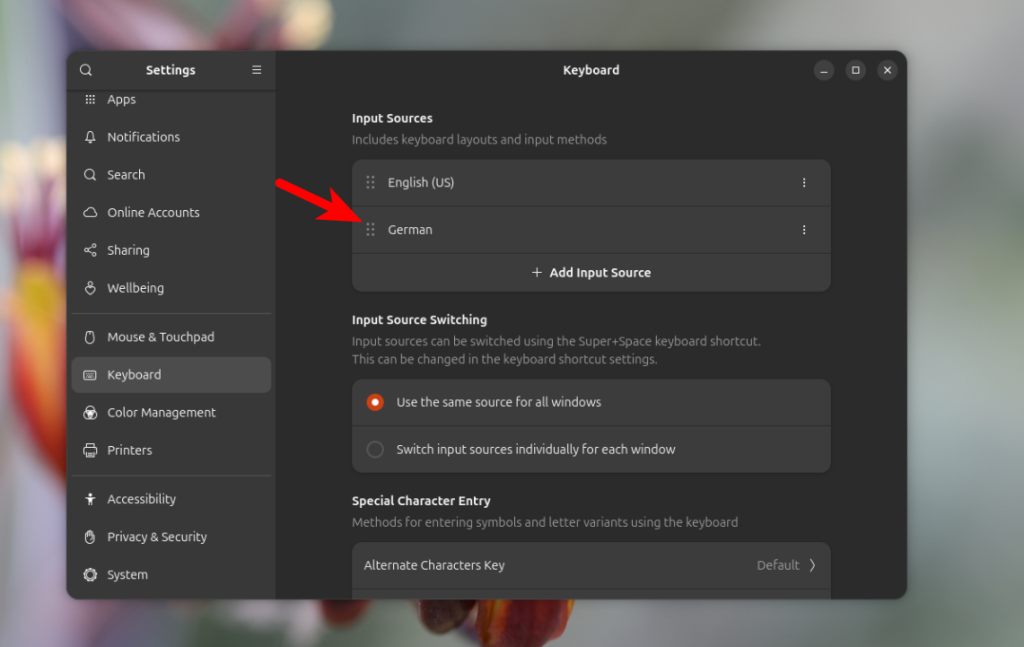 После установки системы у вас будет только одна раскладка клавиатуры если вы не добавили несколько во время установки. Для того чтобы добавить дополнительные раскладки откройте Settings и перейдите на вкладку Keyboard и в разделе Input Sources нажмите кнопку + Add Input Source: