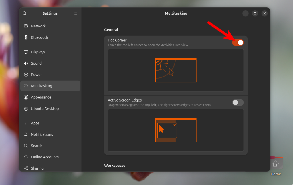 Дальше можем выполнить несколько настроек на вкладке Multitasking. Во первых, здесь можно включить Hot Corner для того чтобы при перемещении курсора в верхний левый угол открывался обзор приложений: