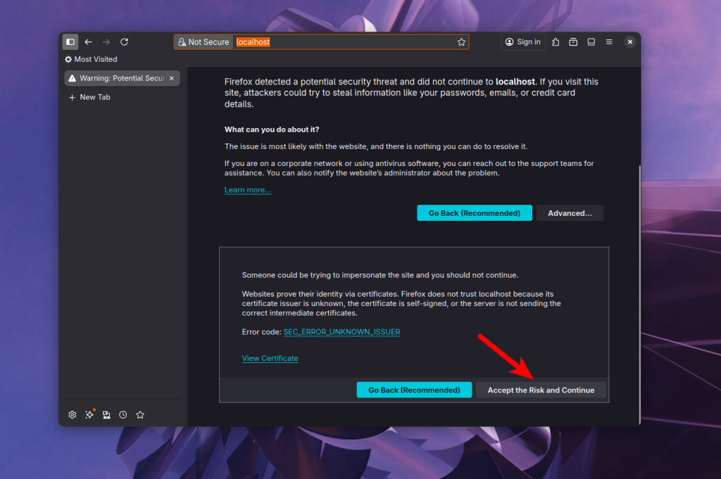 В моем случае это https://192.168.1.111. При первом обращении браузер предупредит что соединение не безопасно, поскольку используется самоподписаный сертификат. Нужно кликнуть по кнопке Advanced, а затем Accept the Risk and Continue: