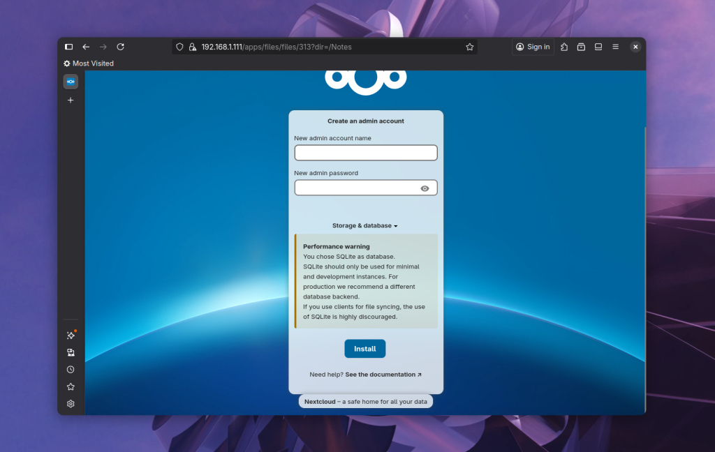 После того как контейнер будет запущен можно открыть адрес сервера NextCloud браузере. Для того чтобы установщик настроил разрешенные домены корректно следует использовать IP адрес, которым вы планируете пользоваться в будущем. Для того чтобы потом получить доступ к серверу из локальной сети, надо использовать IP компьютера, на котором находится Nextcloud. Посмотреть IP можно командой: