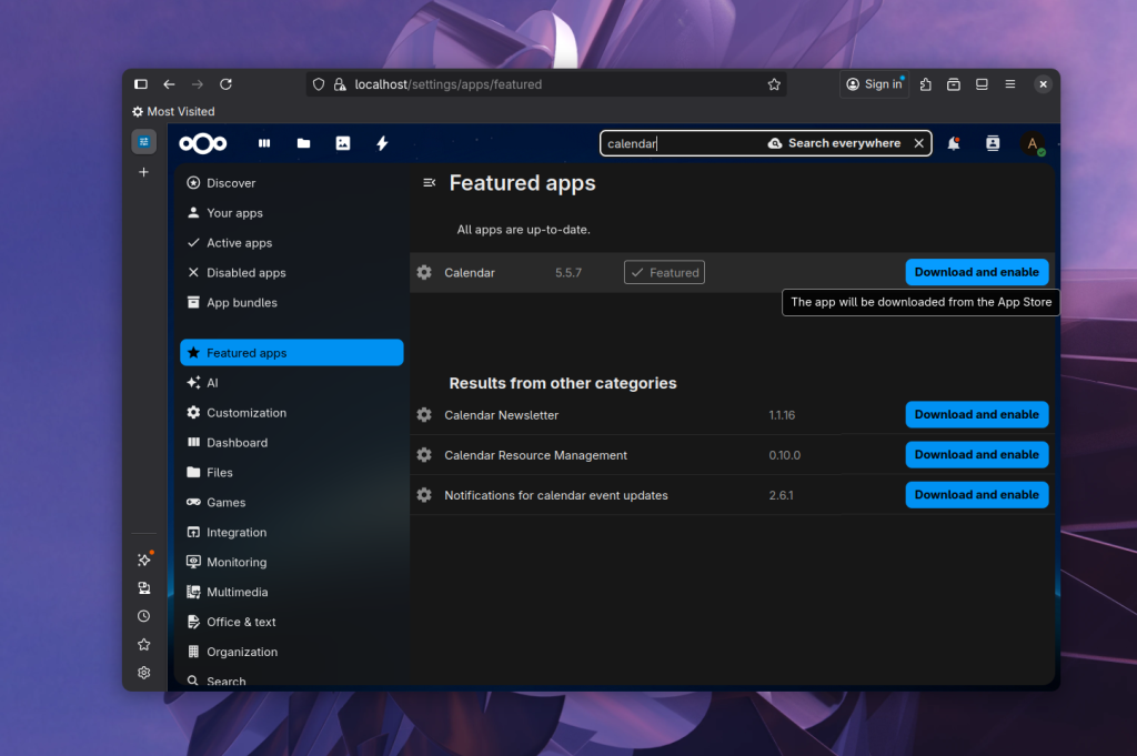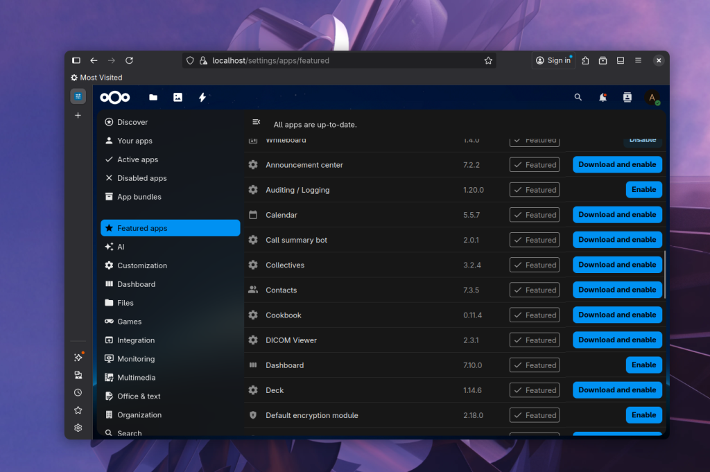 Здесь вы можете видеть все установленные приложения. Их тут уже около 20-ти потому что NextCloud имеет модульную архитектуру. Доступные для установки приложения можно найти в разделах ниже: Featured Apps, AI и т д. В первом разделе находятся отобранные приложения, которые люди чаще всего устанавливают: