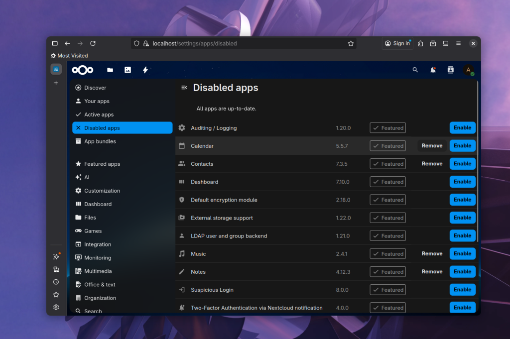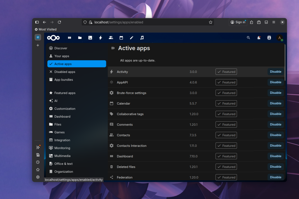 Благодаря модульной архитектуре NextCloud многие не нужные функции можно отключить. Для отключения приложения нажмите кнопку Disable на вкладке Active Apps. Например, можно отключить Dashboard, и тогда при открытии NextСloud всегда будут открываться файлы.