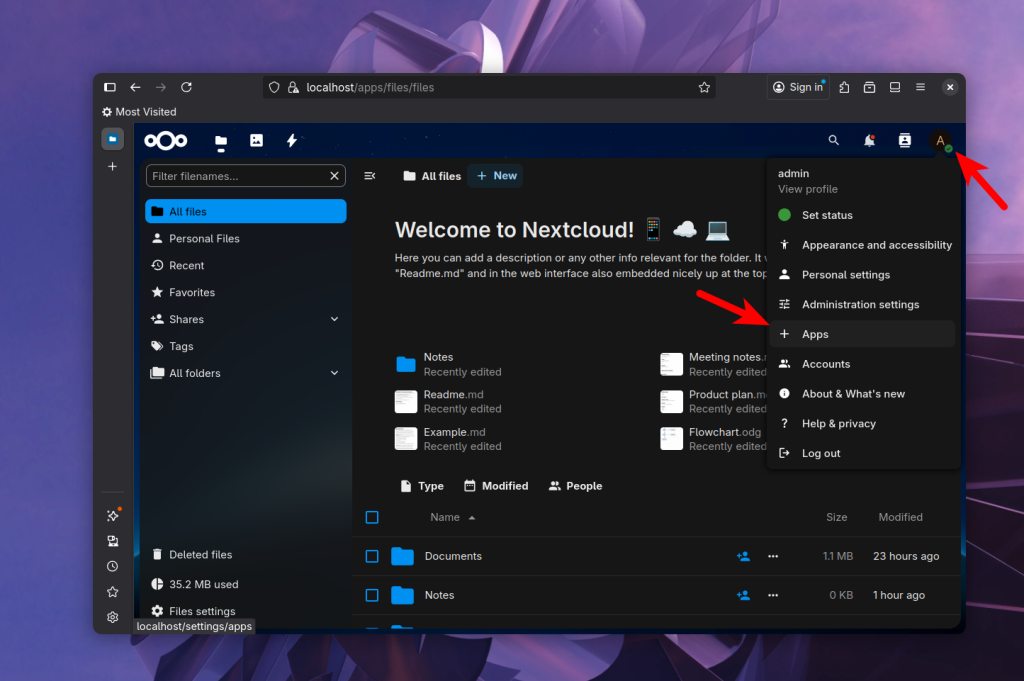 Кроме приложений установленных по умолчанию вы можете установить дополнительные приложения из магазина NextCloud. Их там очень много. Для просмотра установленных приложений кликните по иконке профиля и откройте Apps: