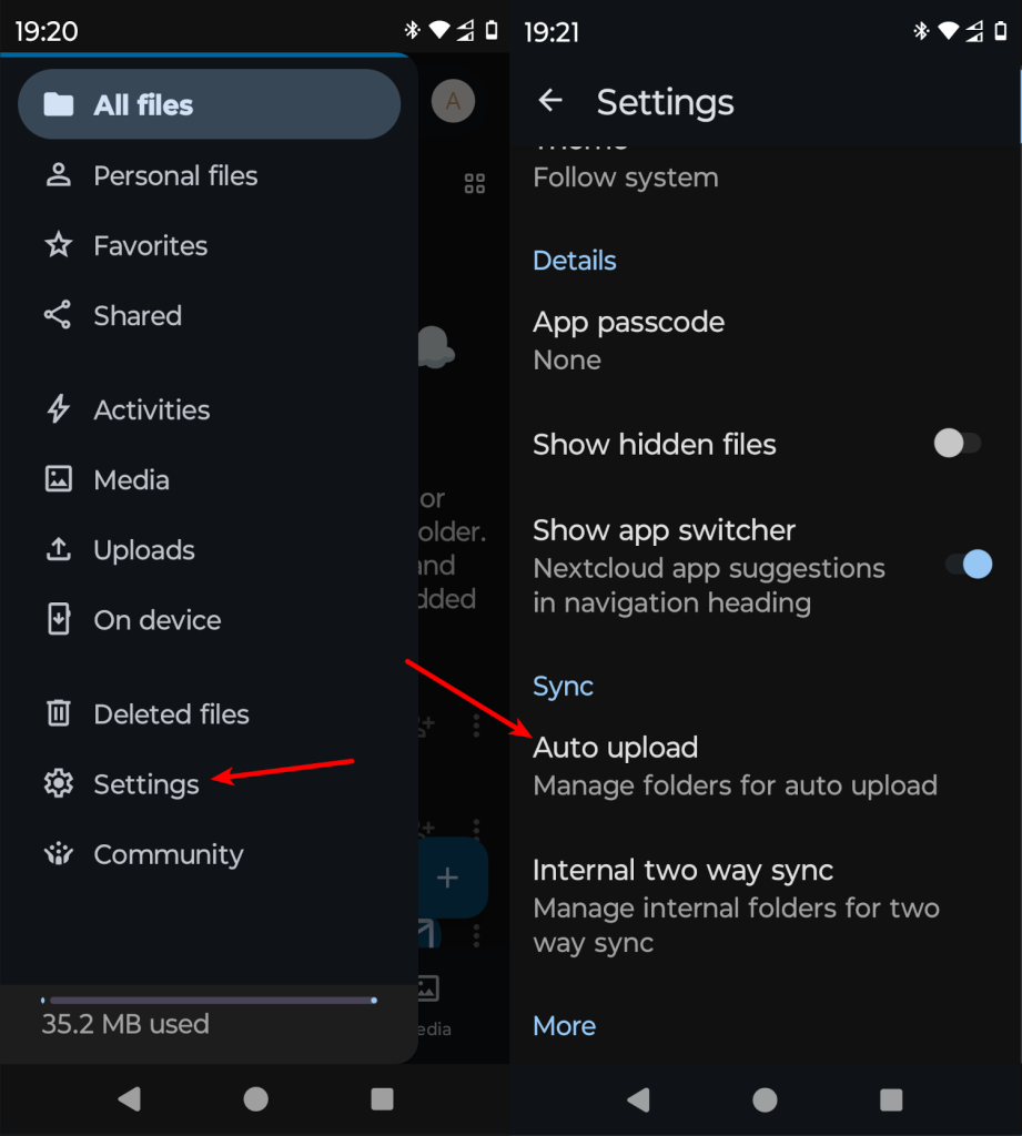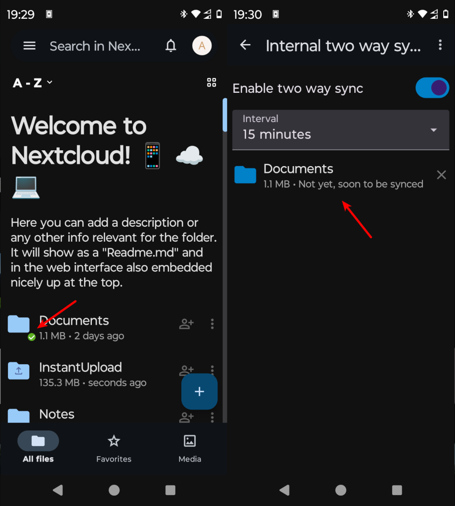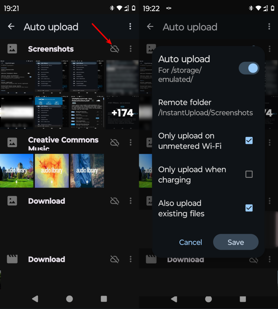 По умолчанию файлы будут загружаться в папку InstantUpload в корневой папке облака NextCloud. Эта функция отвечает за загрузку файлов на сервер. Но также можно и синхронизировать файлы с сервера если в этом есть необходимость.