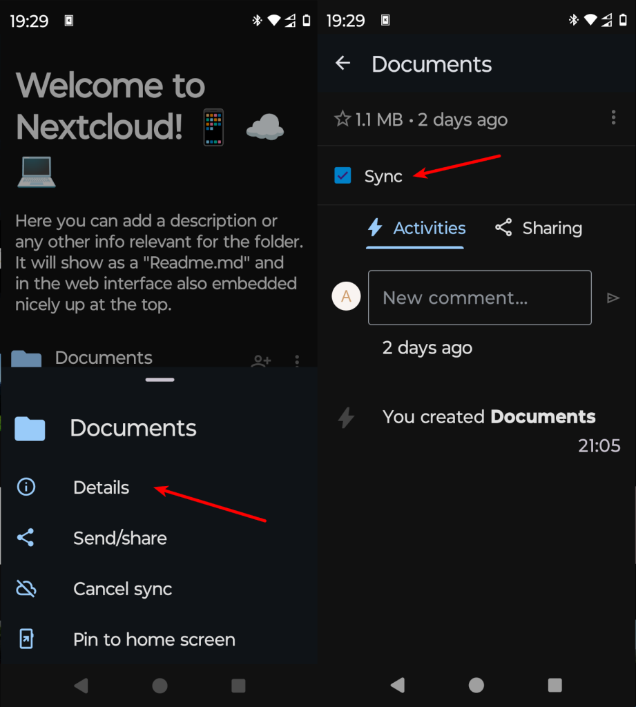 Кроме загрузки файлов в облако, можно настроить синхронизацию локальных папок с облаком. Для надо открыть контекстное меню для папки, например, Documents и выбрать Details. Затем на вкладке Activities надо включить галочку Sync: