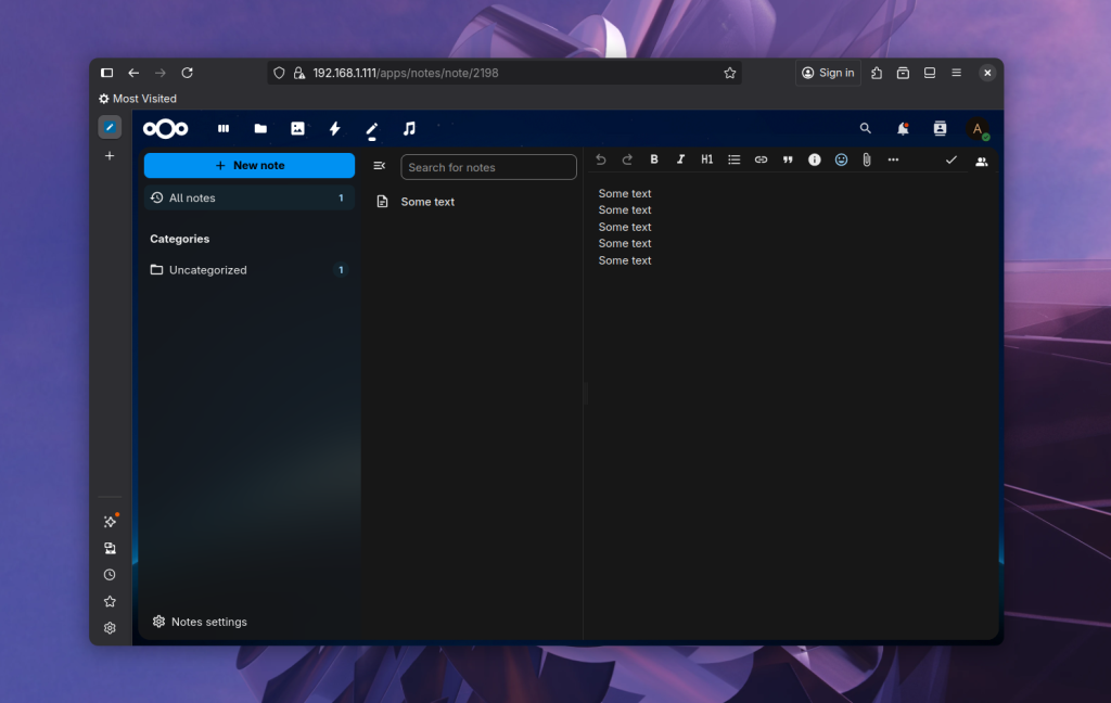Если вы хотите синхроинизировать заметки, то для этого существует отдельное приложение под названием Notes для Android. Но оно будет работать только если вы установили NextCloud приложение Notes в веб-интерфейсе ранее. Android приложение можно установить из F-Droid или Google Play. Приложение подхватит аккаунт настроенный в основном приложении Nextcloud поэтому вы можете открывать его и управлять заметками: