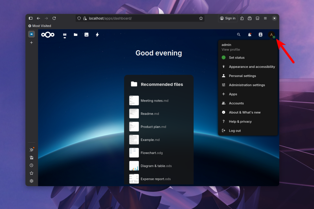 В правой части находится меню профиля, с помощью которого можно настраивать NextCloud, а также устанавливать и настраивать дополнительные приложения:
